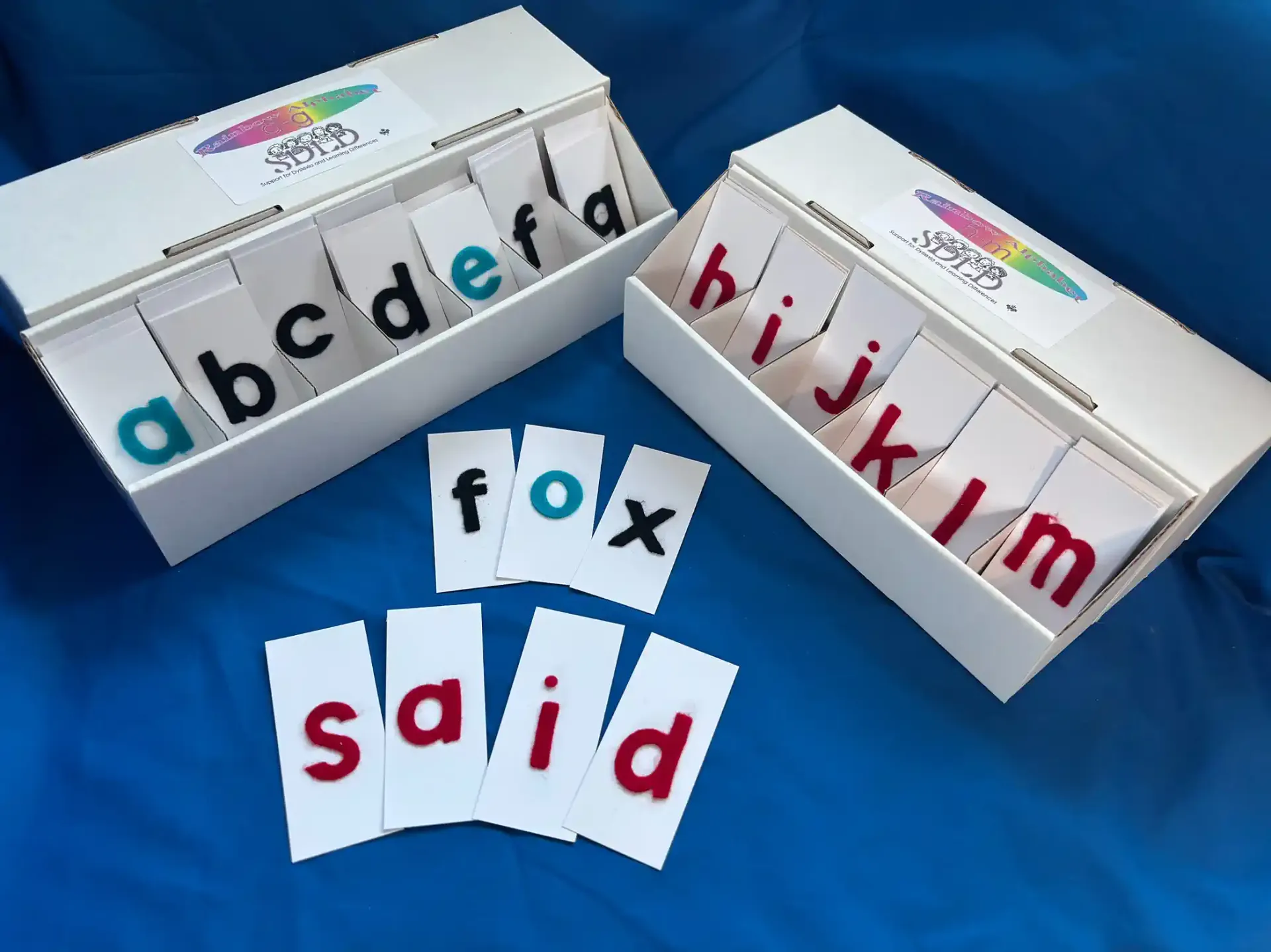 4 boxes created in a rainbow shape designed to hold red and black felt letters that are sized for children to trace. The boxes can be used in sections to teach the alphabet or together to teach sight words and phonetic words.
